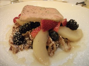 Zobel’s version of French toast, uses Challah, which is waffled, topped with poached pears, strawberries and blackberries, then crowned with a thin sliver of foie gras. Dabs of chestnut jam (on the Challah) add another subtle dimension of sweetness. It was the most delicate-tasting “French toast” I’ve ever had, a perfect balance of sweet and savory. I ate it all. It left me feeling happily satisfied, but not stuffed.