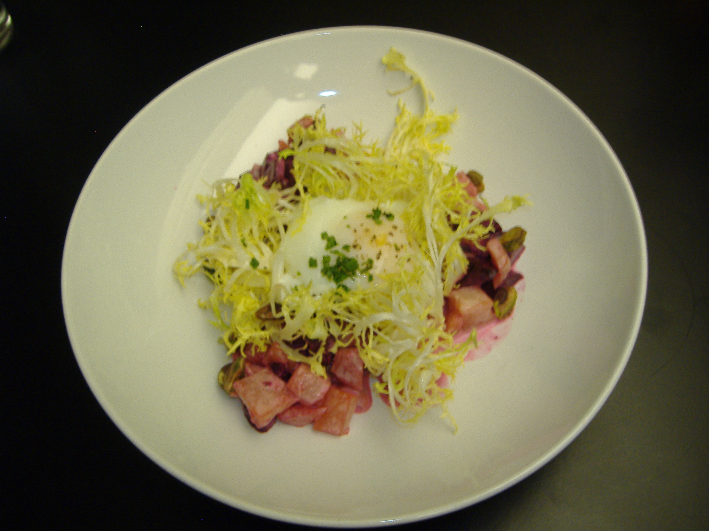 For me, a startling—and delightful—dining revelation was the accessibility of vegetables on restaurant menus. At Habitat in the Fairmont Hotel, I had a beautiful baby bibb salad with toasted hazelnut-dijon dressing (above right). At Salt of the Earth, Chris enjoyed a gorgeous beet and frisee salad lightly perfumed with truffle oil and topped with a poached egg (right). Several salads, featuring local produce, were on offer at Toast!, including black truffles paired with roasted local beets and a rocking smoked trout salad with curly endive.