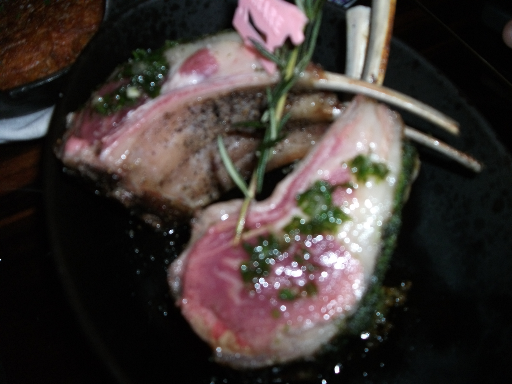 Our respective red meats—I had ordered a 22-ounce rib-eye; Chris, the rack of lamb—arrived in cast-iron cocottes. With them, came a flurry of sides: grilled asparagus; roasted Brussels sprouts; jalapeno mashed potatoes; and leek hashed browns.