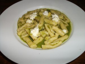 Christopher’s hand-made cavatelli ($10/$18, below) in a green onion brodo, delicately flavored by a medley of squash, zucchini and sugar snap peas, tasted of spring. I, too, opted for pasta…the legendary hand-made Maw Maw’s ravioli, of course. That secret ingredient in the gravy? Chicken gizzards…