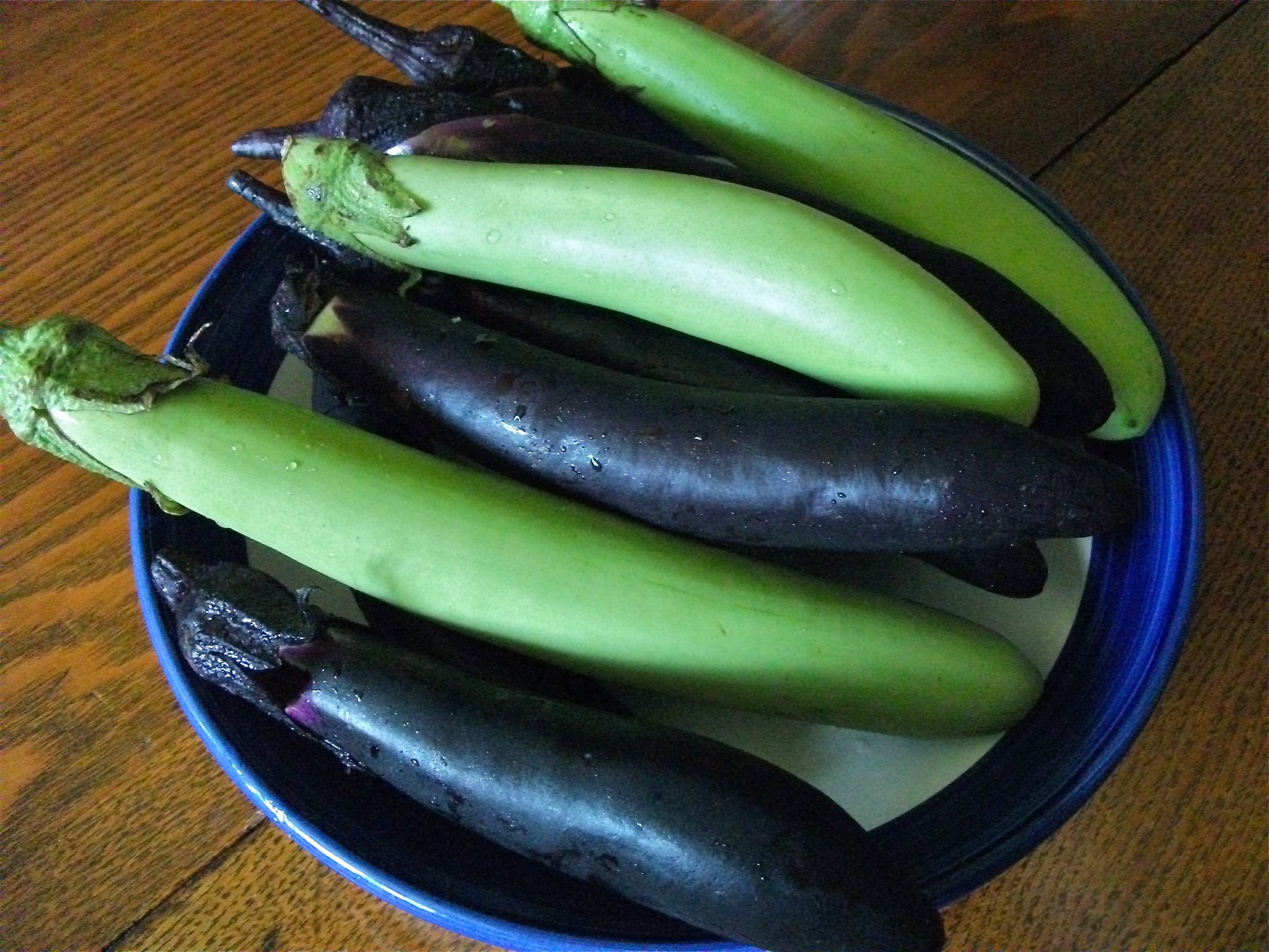 Asian eggplant: I’m drawn to long, smooth-skinned slender ones—whether dark purple, pale green, or white—with firm but springy flesh that gives a bit when pressed.