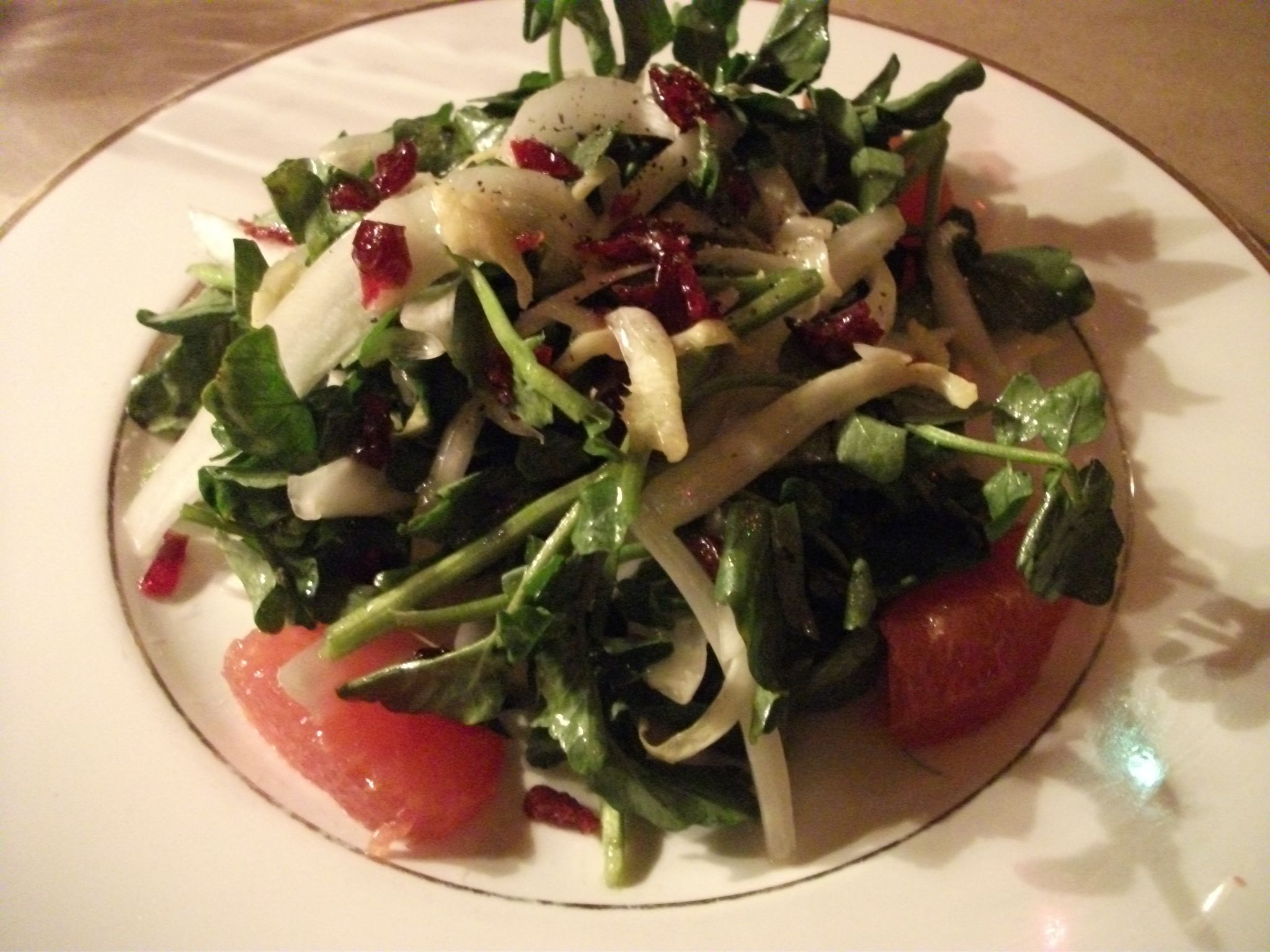 Lovers of leafy greens, take note: the endive and watercress salad with fennel, pomegranate seeds and ruby red grapefruit is winsome: bright, zesty with delicate crunch and zing.