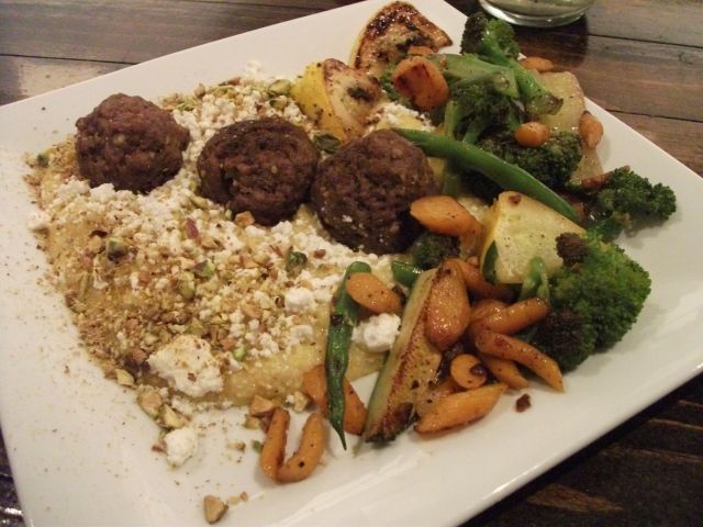 Christopher’s cinnamon-spiked local lamb meatballs in a bed of creamy polenta garnished with roasted pistachios was served with a generous medley of roasted vegetables. Savory and satisfying.