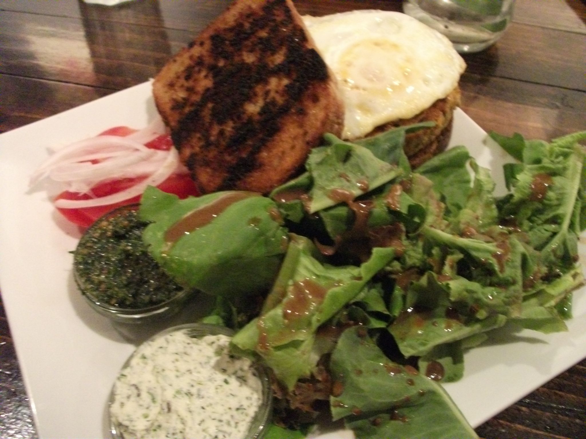 My “veggie burger”, for example, was no Boca Burger! Mine was a mid-summer garden bounty of parsley root, carrot, summer squash, zucchini, purple top turnips, sweet potatoes, red potatoes, garlic, shallot, onions and bound with a little egg and cornmeal. The patty, warmed on a grill with good olive oil, and topped with a local egg, resides between two slabs of toasted quinoa multigrain. My burger arrived with a parsley-almond pesto and a lovely salad of tender Bibb lettuce.