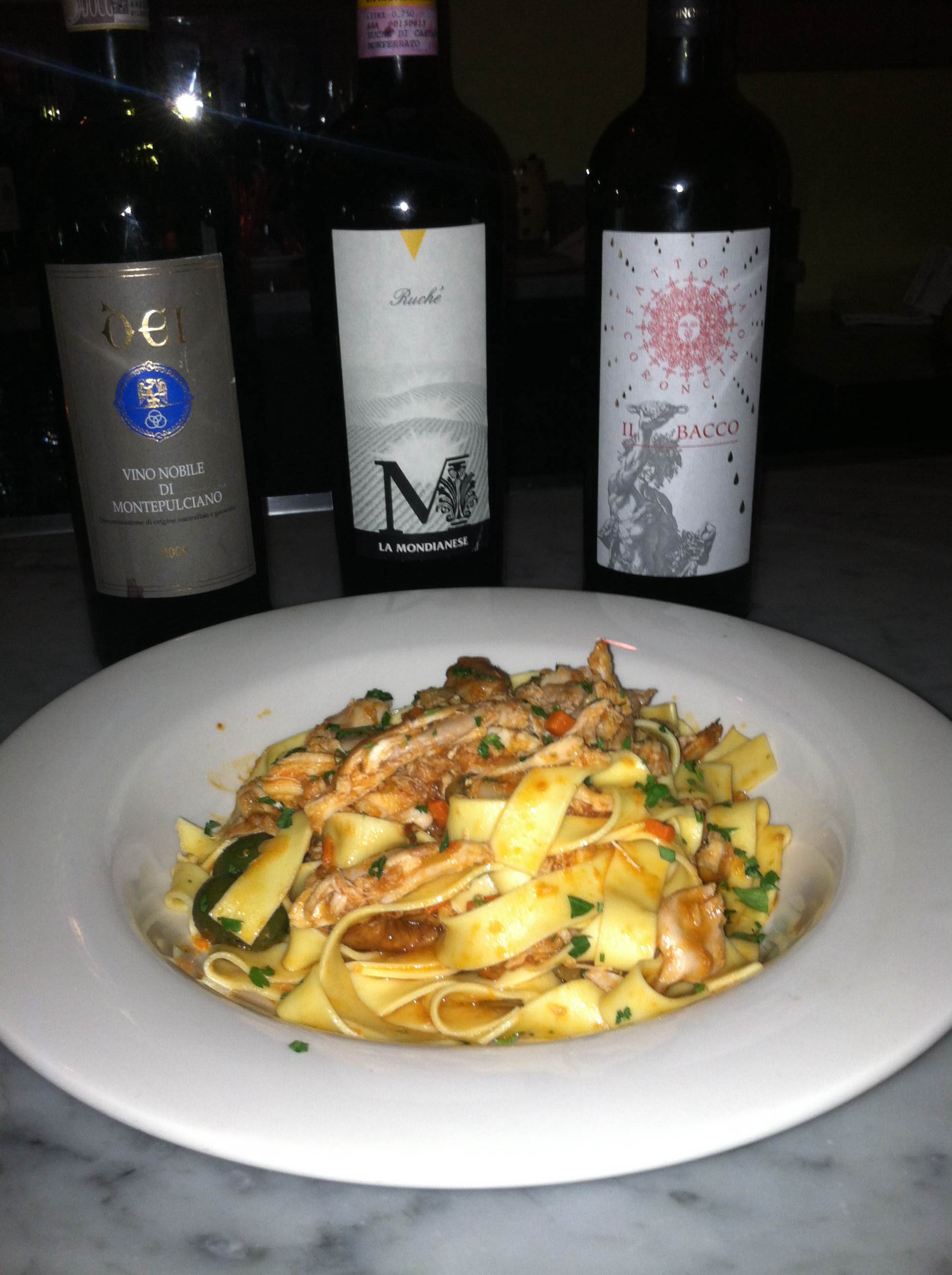 Seeing the commotion at the bar, Chef Buitoni asked what was going on. Then, naturally, he joined the game. Initially, he voted for the Vino Nobilo, but then he came up with a third, apparently out-of-the-box (white) choice: a Verdicchio (Fattoria Coroncino, Il Bacco 2012), from the Marche, in East-Central Italy.